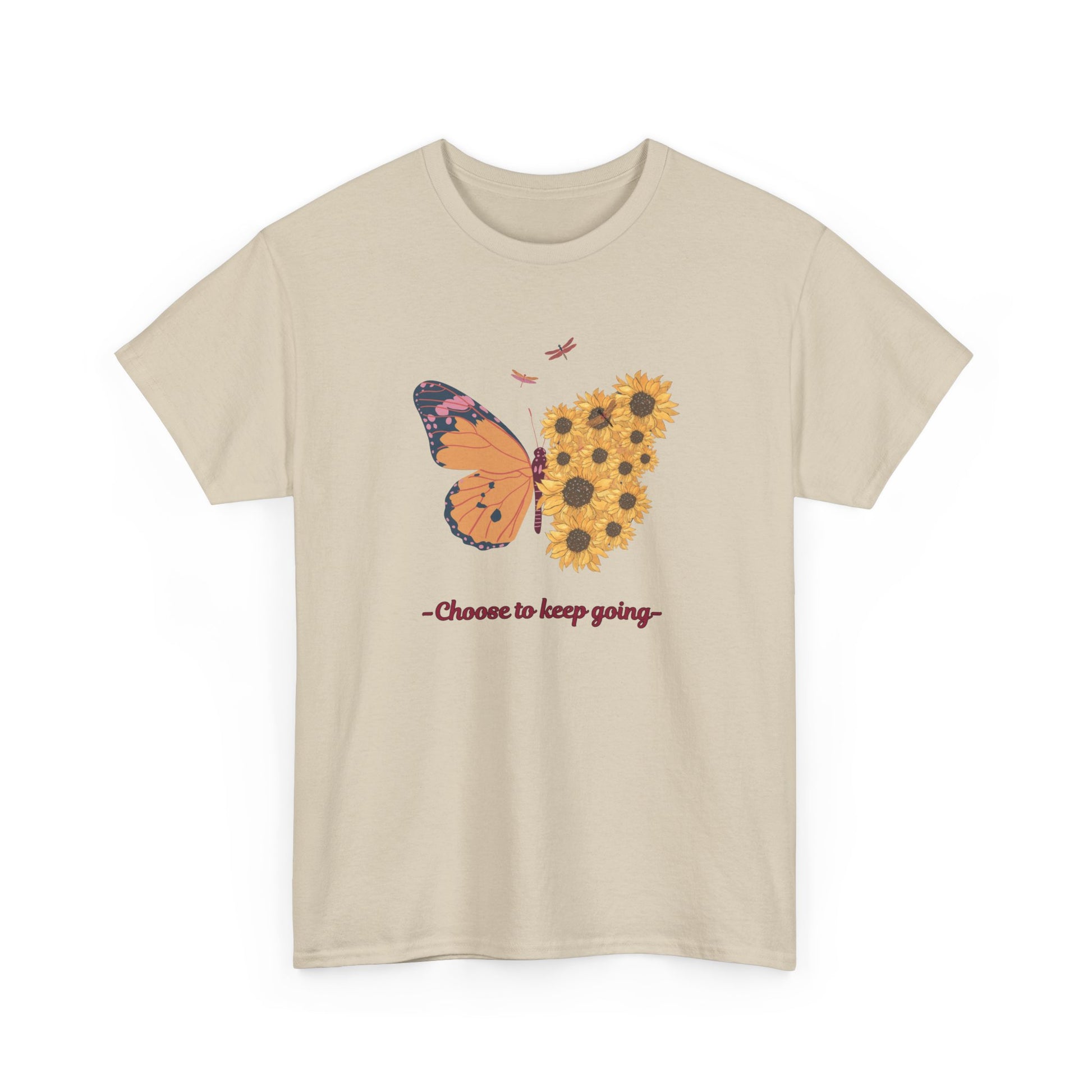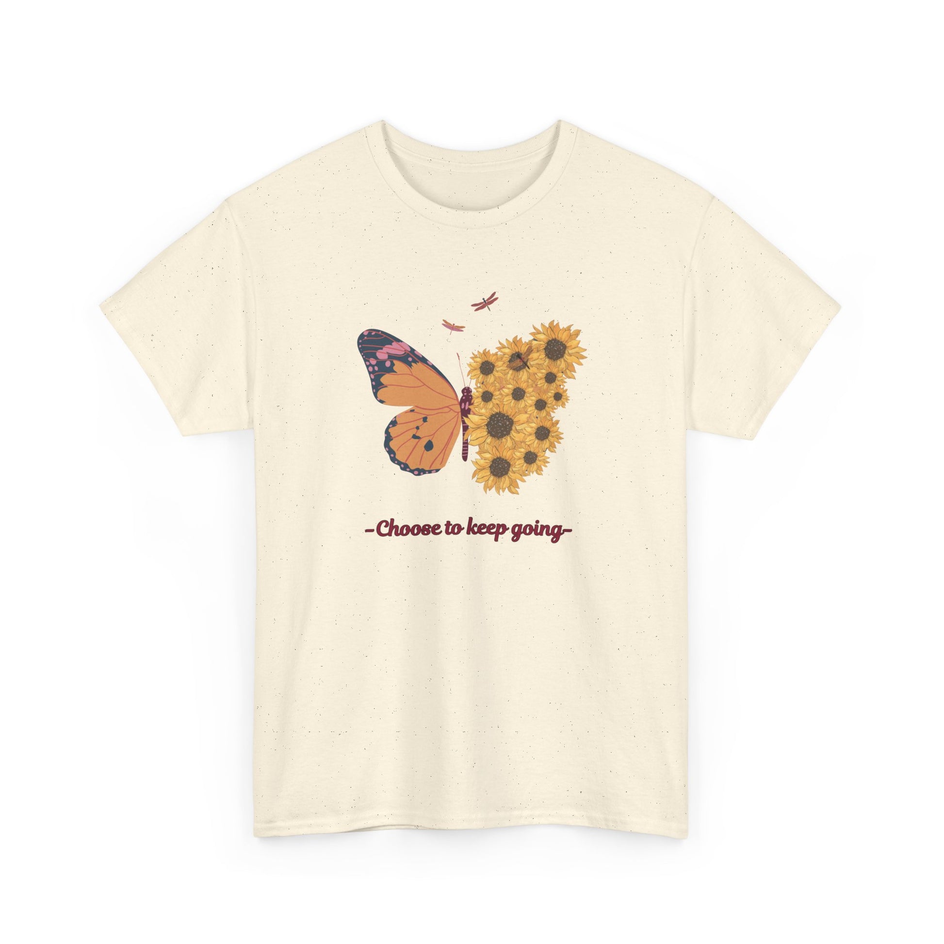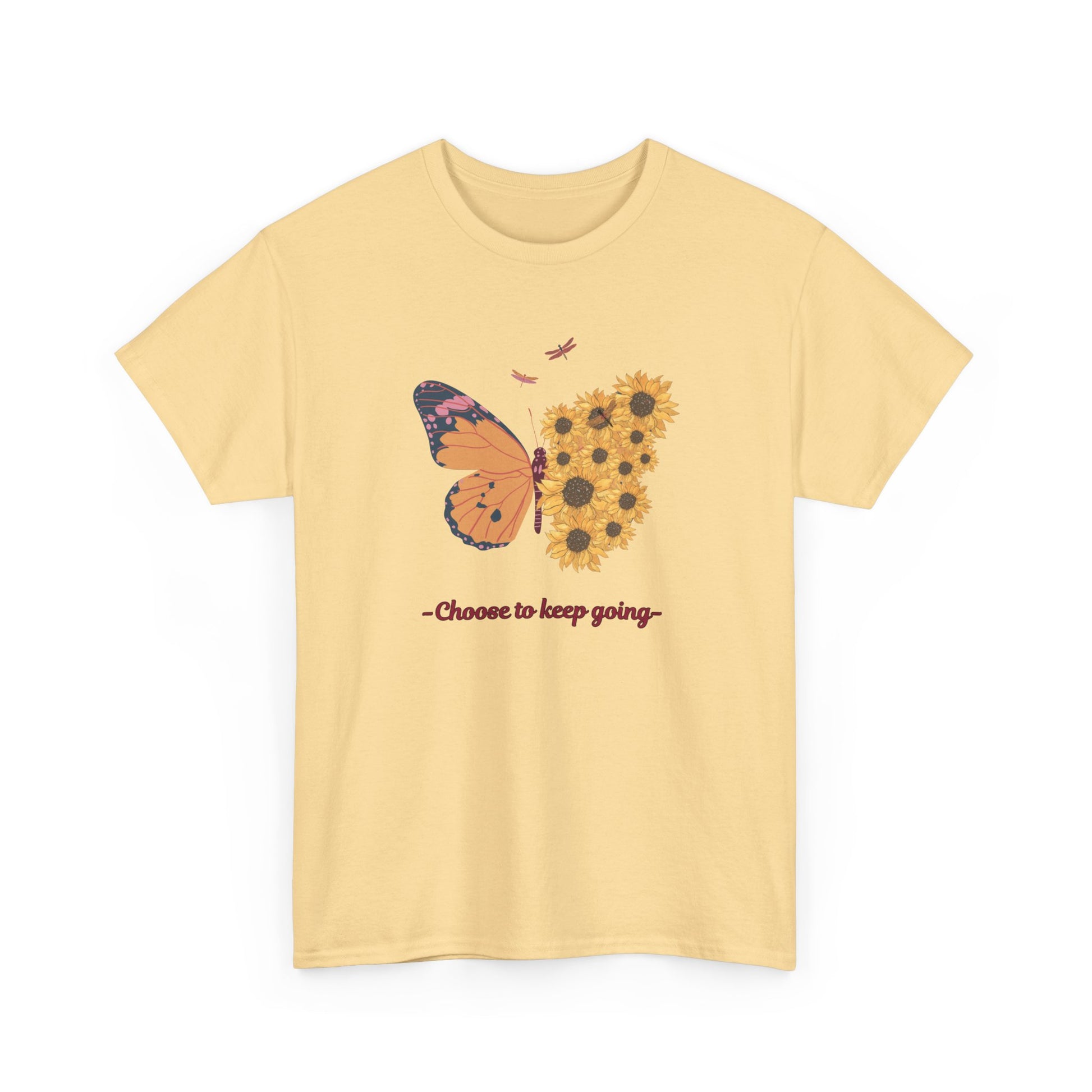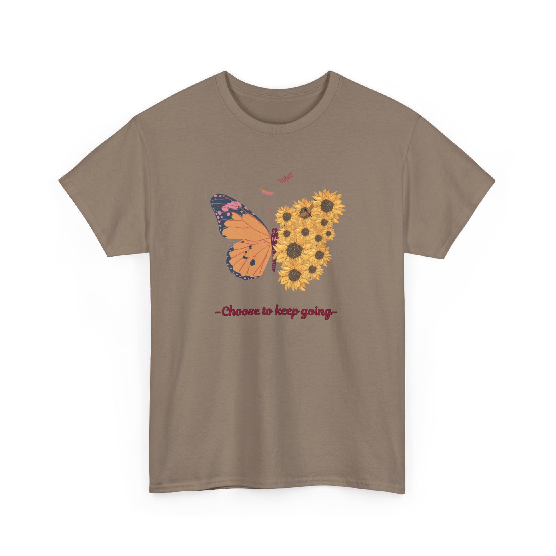 Introducing our vibrant Unisex Heavy Cotton Tee, a perfect blend of comfort and style! This shirt features an eye-catching butterfly and sunflower design with the empowering message 'Choose to keep going.' Instantly uplifting, it brings a sense of optimism to your wardrobe. Perfect for anyone looking to express their soul in a casual manner, this tee is great for various occasions—whether you're gifting it for a birthday, celebrating a friend’s achievement, or wearing it everyday to embrace positivity. With its classic fit and soft fabric, it's ideal for lounging at home or grabbing coffee with friends. This tee is designed for adults who appreciate quality and creativity in their everyday wear.